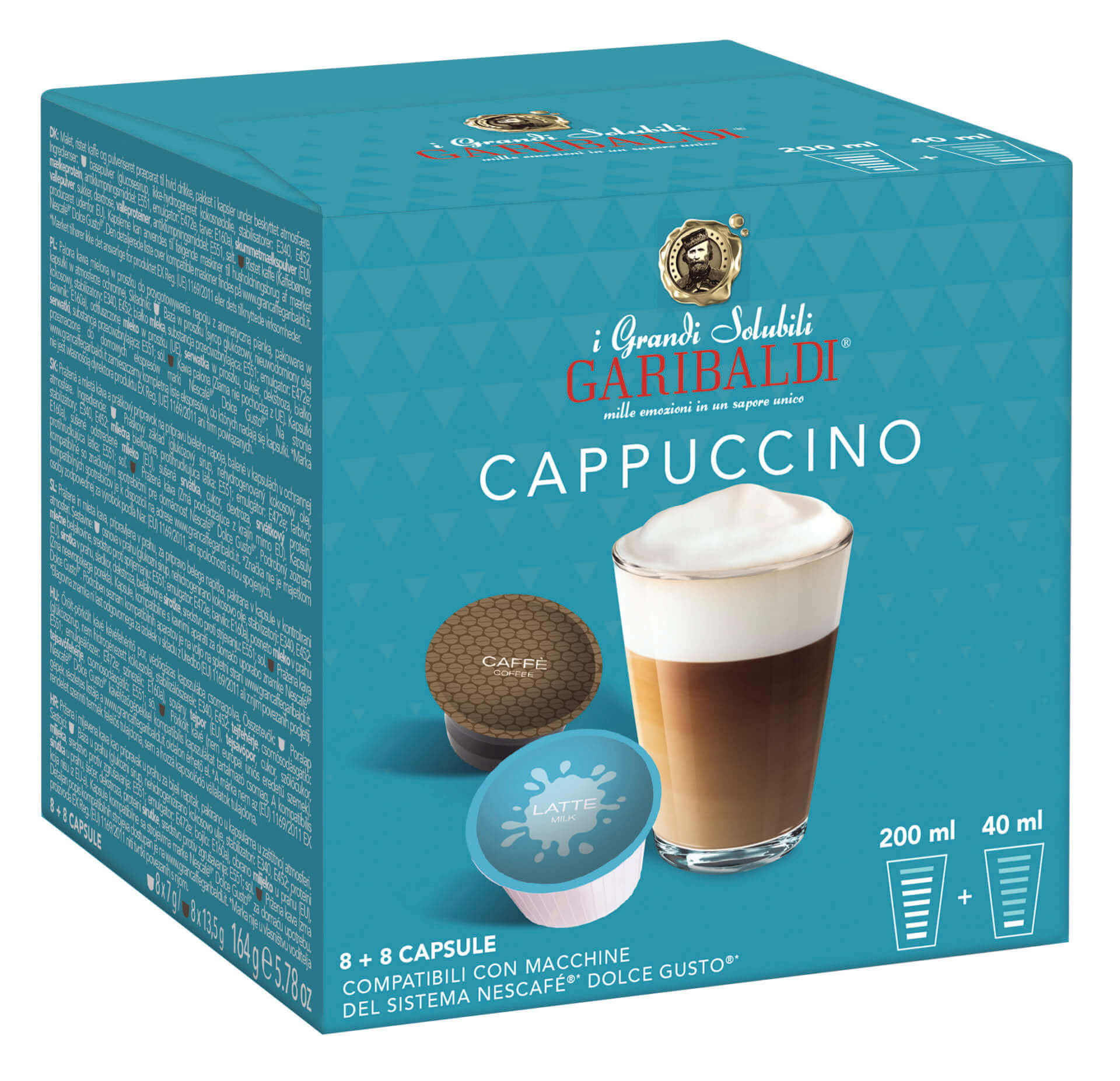 Karbis on 16 kapslit (8 kohvikapslit + 8 piimakapslit), mis on mõeldud NESCAFÉ® Dolce Gusto® kapslikohvimasinatele, et valmistada 8 tassi GARIBALDI Cappuccino kohvi. Kohv on pakendatud spetsiaalsetesse hermeetilistesse kapslitesse. Nii säilitab kohv oma iseloomulikud omadused ka mitme kuu pärast.